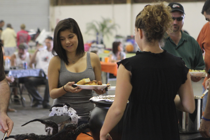 Trophy Dave lights the stove burners to warm the meatballs with Ray Williams and granddaughter Jessica looking on.