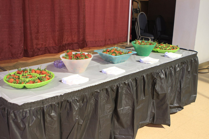 Julie Shiosaki and Shelley Ostling hold up a sign that say L - Z for check in alpabetically.