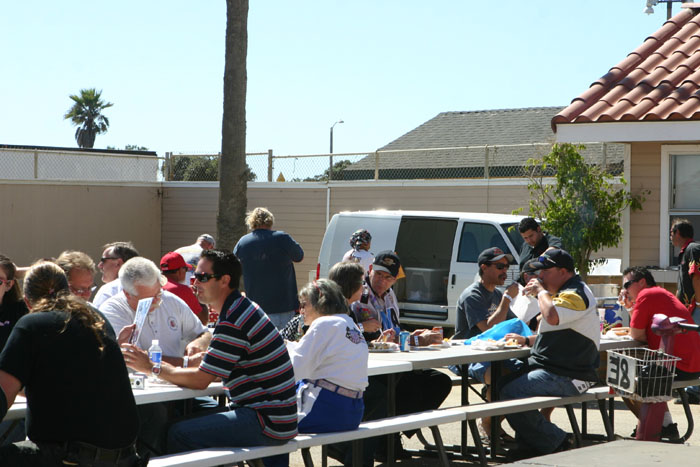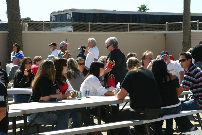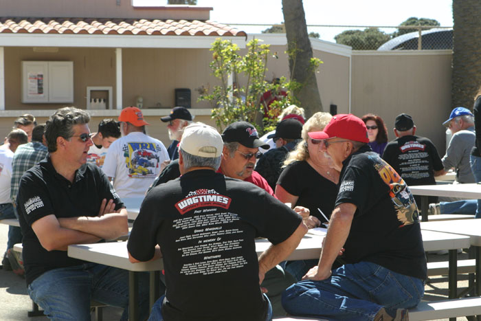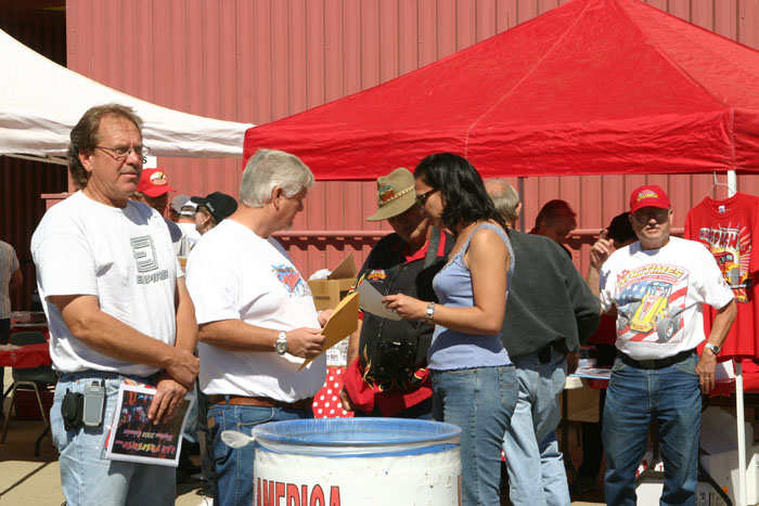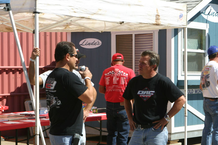 Bill Camarillo and Chris Wakim chat near the aucton table. Bill ended up with the black helmet autographed by all the drivers.