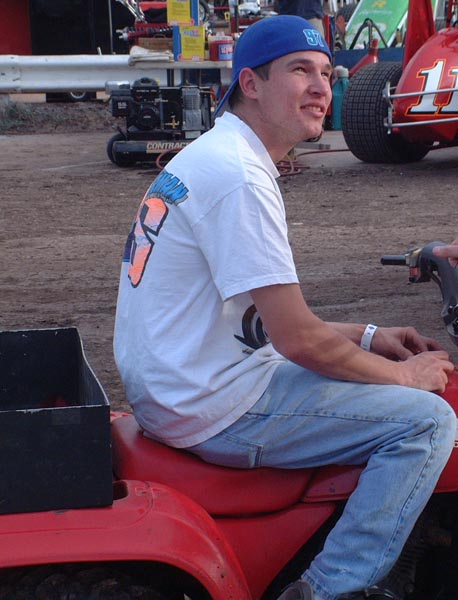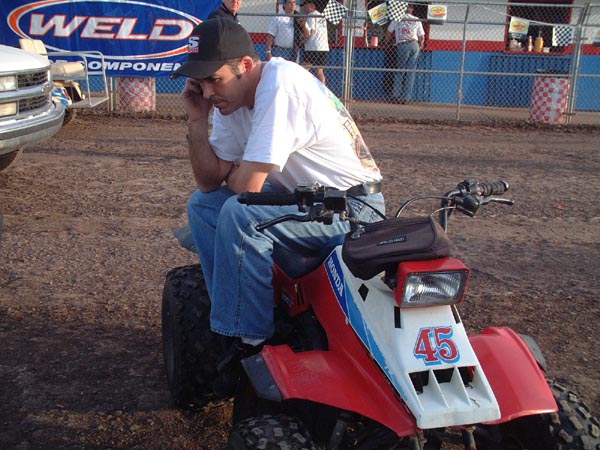 Ben Thrasher sits on his quad in the pits.