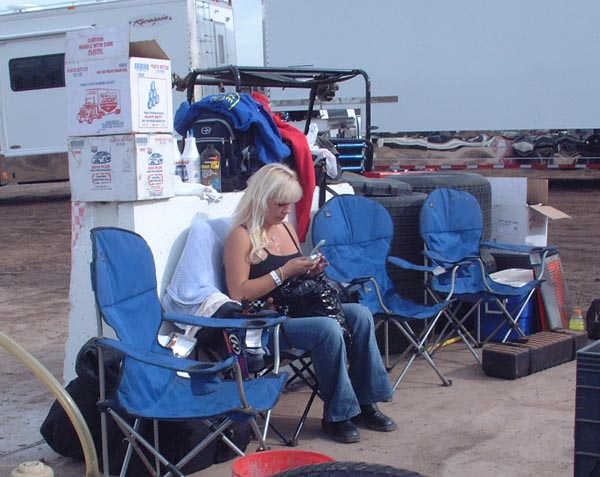 Ronnie Case’s lady, Patti, is trying to get phone coverage in the pits.