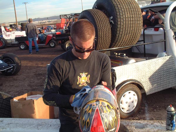 Alex Pruitt cleans and gets Darland’s helmet ready.