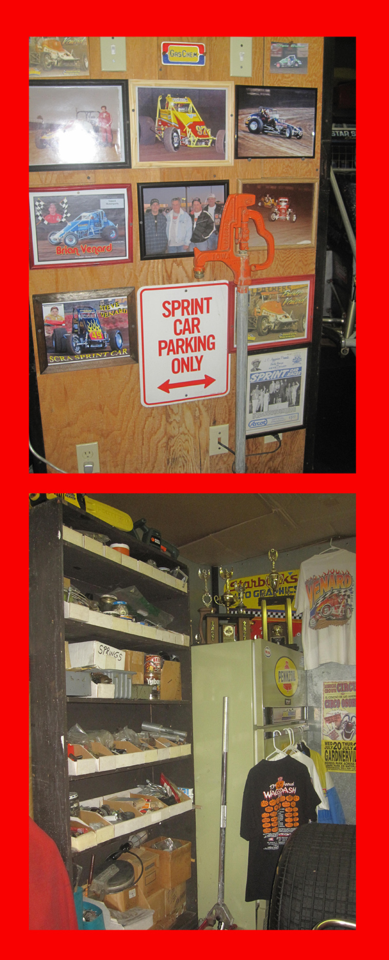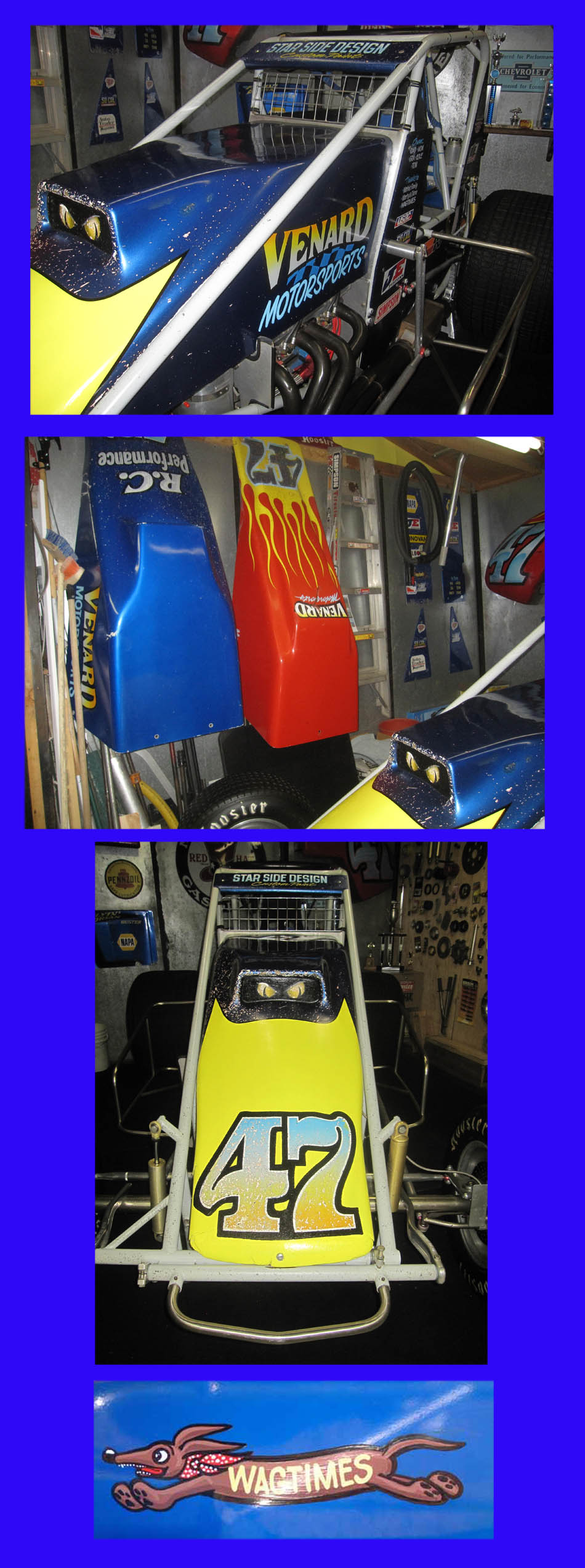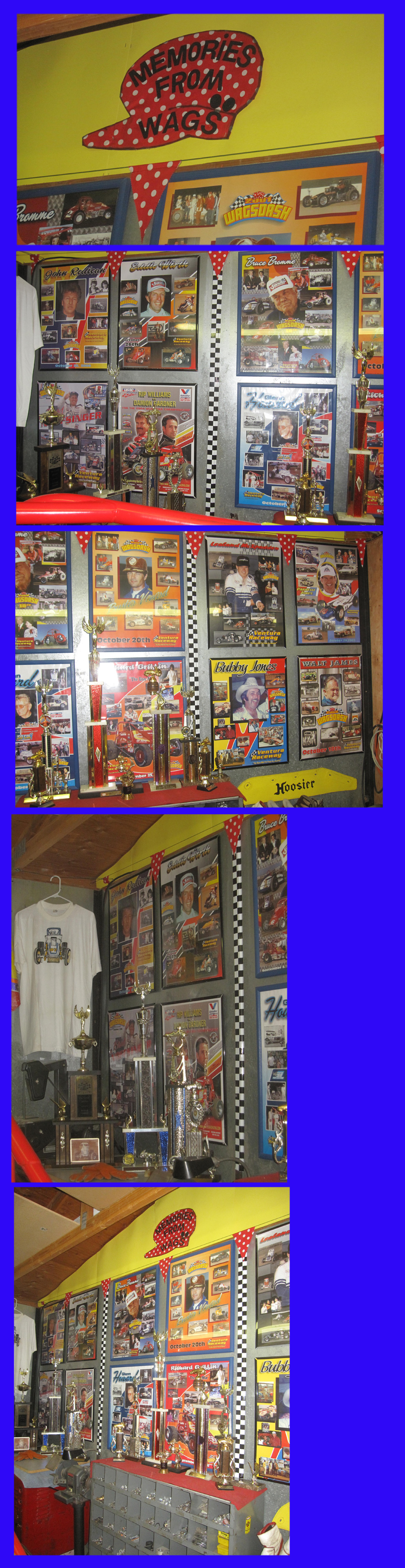 On Thanksgiving weekend we did a double visit trip of some 1500 miles from Vegas and after attending the Trophy Dave lighting for Make A Wish in San Jose, Mrs Wags and I cruised across to Mendon, NV for a visit with Darleen and Stubby Dils and Linda and Buster Venard in nearby Gardnerville. It was a great visit with dinner at an Italian restaurant with the four of them plus a visit to the race shop where Buster hides his two sprint cars and a lot momemories from his racing days and that of his two sons Steve and Bryan. Although the race cars haven't been on the track since Buster moved from Tustin, CA to Gardnerville, they get out to car shows and occasionally get lit up in the neighborhood when the boys come to visit.
