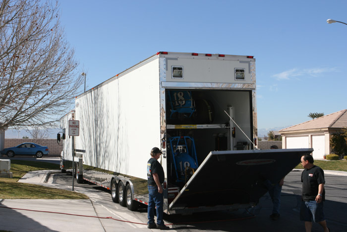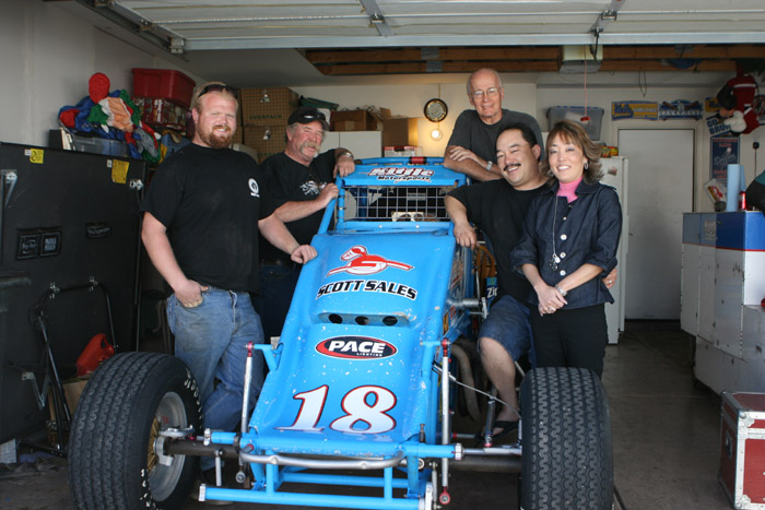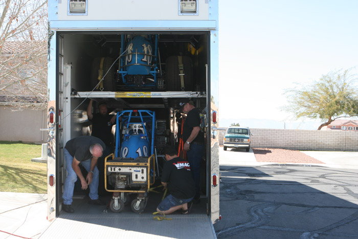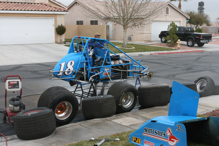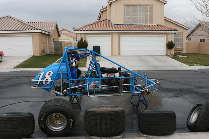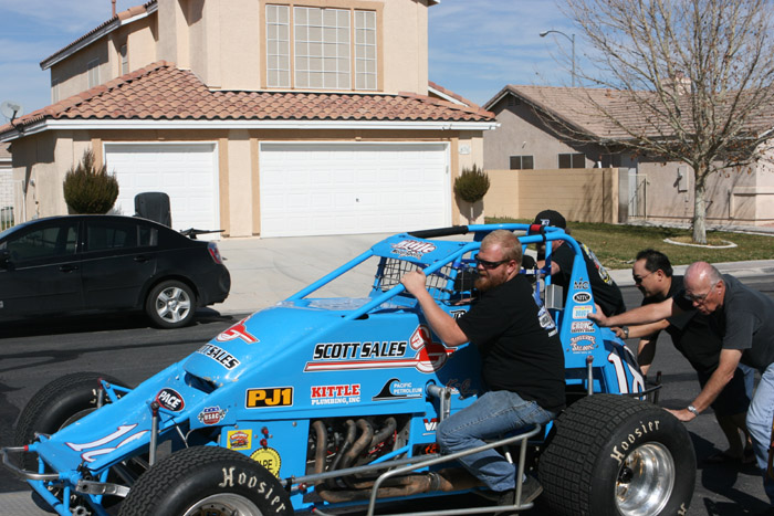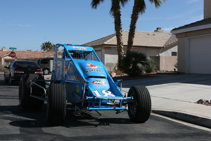 It's not often you have a hauler pull up to your house and unload a racecar. After the Manzy races, the Kittle Motorsports team travelled on to Las Vegas and made our house a planned stop. After my taking a couple of trips with them last year, it was only fair they took a trip with me at Wagsland. Since they had a few days between races, it gave the team a chance to relax and work on their race car with no distractions in the comfort of my garage instead of a motel parking lot. Randy, Julie, Chad, Ralph and Paul showed up on Sunday afternoon and parked the long rig in front of my house. We live on a Culdesac, so other than blocking my view of the neighborhood, it fit in like a glove. We had our usual Sunday family barbeque that evening, so some of the family came over and entertained the team during a hamburger feed. Afterwards the gracious crew unloaded the little blue bomber and we had show and tell time. The kids had a chance to get in the car and we took some pics. All in all it was a first for many of my family, but they seemed to enjoy it all. For the next two days, Randy and the boys serviced the car and did the things they would normally do back at the shop in an unstructured kind of time. Julie kept up with her business and did some USAC stuff as we visited and enjoyed it all. Mrs Wags even took off Monday to hang around and be part of the fun time. Monday night they took time off to go party at the Orleans where all the racers stayed where they could let their hair down and relax a bit with other racers, but were back at it Tuesday morning. When they finished up all the prep work, cleaned up my garage better than when they arrived, they loaded the car and tools back in the hauler, then headed to the hotel to get ready for dinner. That evening we met them and Fran & Jim plus photog Jim Fargo at Joe's Steak and Crab house in Ceasars Forum shops. An evening of eating and enjoying the outstanding steak and crab feast, and the good company, was had by all. We tasted some deserts that included their famous Key Lime pie and it was all thumbs up!! As we parted ways the next stop would be at the Las Vegas slick track slapstick event the next night. Terry and I were thrilled to host the team for their short stay with the hopes we can do it again. Of course I would prefer they don't ever race here in Vegas again, but I am not in charge. Thanks Kittle Motorsports for giving us a rare view of your outstanding team! Now on to the races.