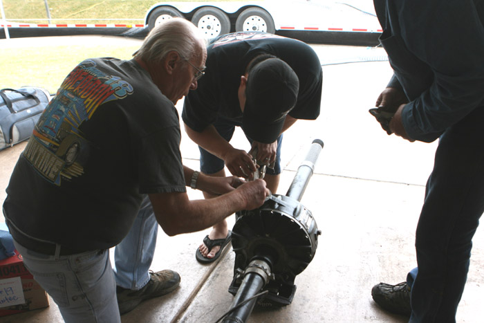 Paul and Randy carry a broken rear end in to the garage to make repairs.