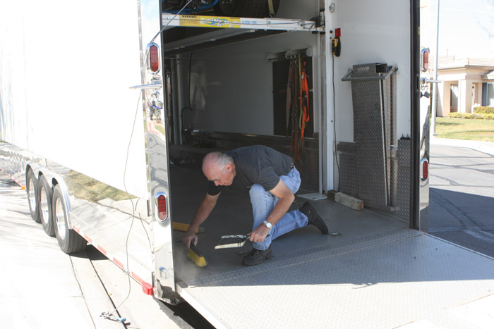 Chad gets to ride as they push the little blue bugger up the ramp.
