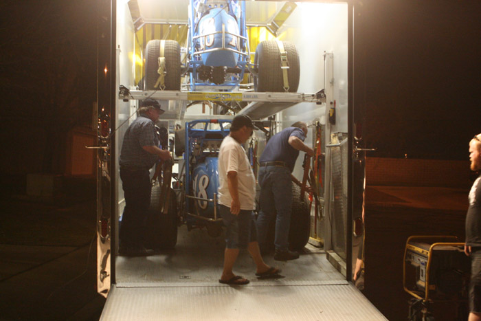 The kids go outside after dinner to see the race car coming out of the hauler.