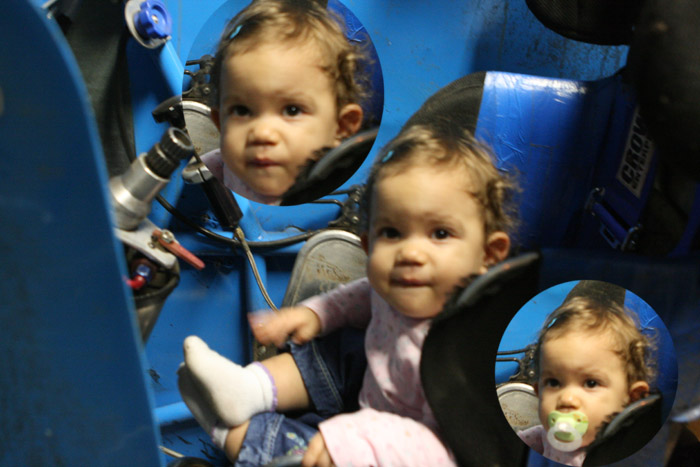 Little Isabel, my grandson Tory's daughter, is lost in the cockpit of Danny Sheridan's ride.