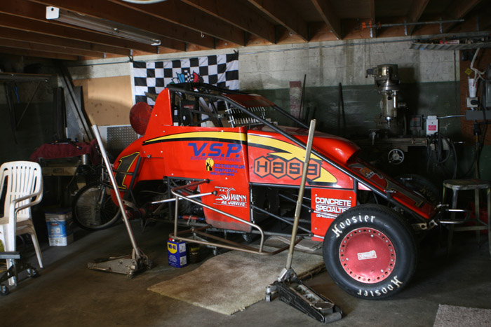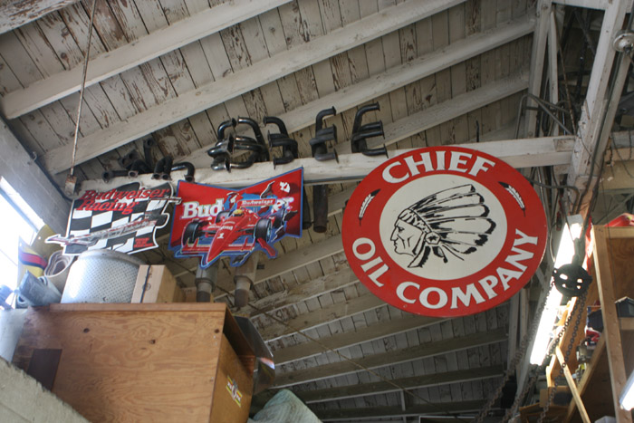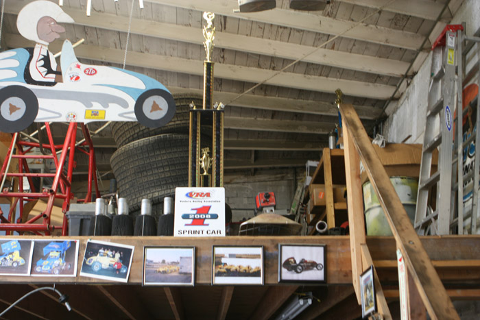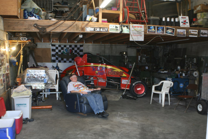 This now is today's story where inside his small probably 30 square foot shop there is enough room to shoehorn in several race cars and little else. Kevin added an attic in the form of a wood floor above half the shop where he stores things he needs including chassis and more. Anyway getting back to biz, I left home early in the morning of the day of my visit and arrived in Burbank at the Bunker a few minutes before noon. Kevin wasn't there yet, but his old fiend Lou was. The area surrounding the bunker is packed with all kinds of vehicles, including a lot of cop cars, ambulances and burned out wrecks. All of which is used in the movies! I found the door to the shop and entered as Lou was relaxing in an overstuffed rocker. Lou was born in 1918 and so he has been around a long time. He was there for the start of the Salt Flats racing in Bonneville, and the start of the WRA and much more racing history. Now he spends a lot of time at the BUnker, being still involved in racing and following Kevin's exploits. When Kevin arrived, we went thru a lot of history of the bunker and more war stories, then headed off to lunch. After that we had a little visit to Jay's Garage, but that's another story. Visting with Kevin in his race shop was another of those priceless adventures and I am thankful for the time he spent with me.