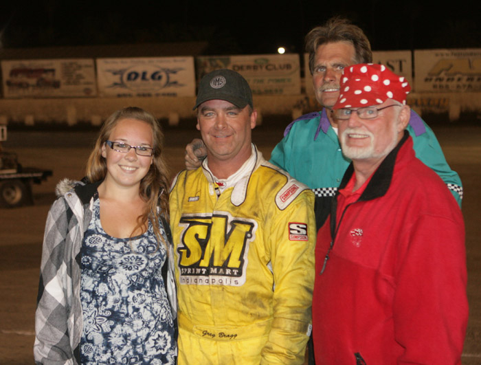 Gregg Brag and daughter Kaitee and car owner with the Wags after the Wagsdash. He was 4th and the hard charger.