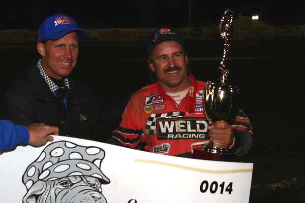 Dan Hillberg had a great night, after he endured this mess. Later he made the main event and then turned the car over to Mike Kirby when the # 38 car broke. His team got the best appearing crew award and some cash to go with it.