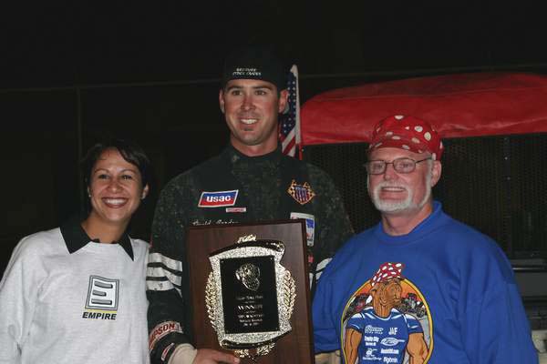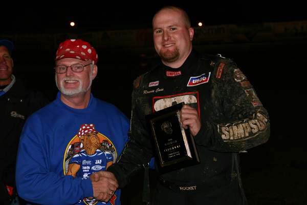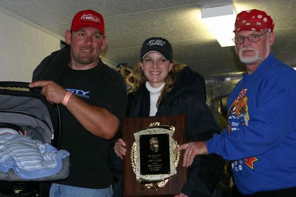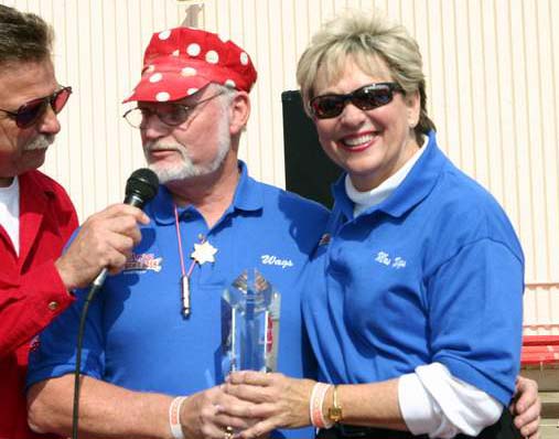 Tony and Tammy Jones, and Grady who is hiding to the left, receive the Big Dawg Dash trophy from Wags later. We should have done this on the front stretch, but the rains, the rains.
