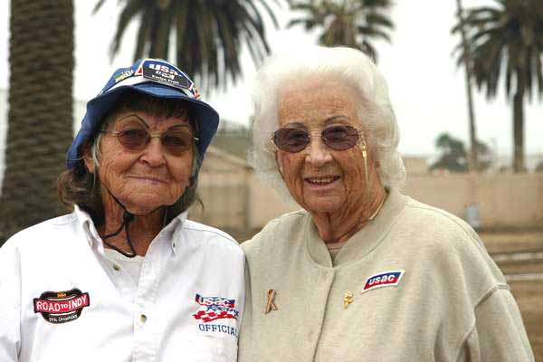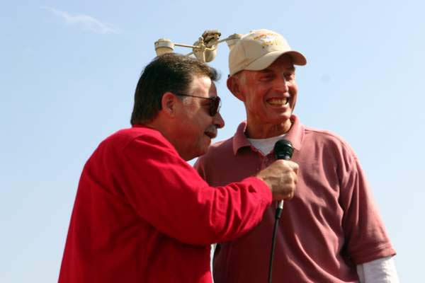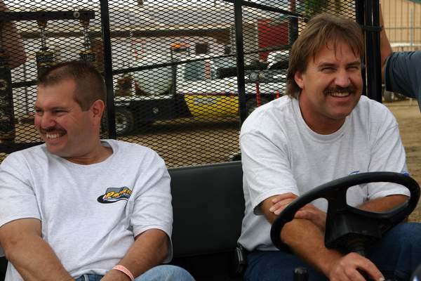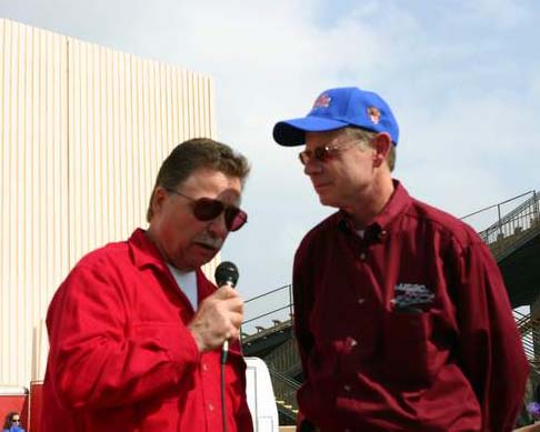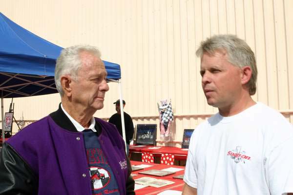 Rollie Helmling and track promoter Jim Naylor get together for a few grins.