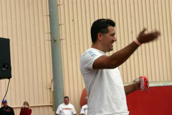 Dennis Rodriguez, a newly married driver, tries to get the crowd to make a little noise for him.