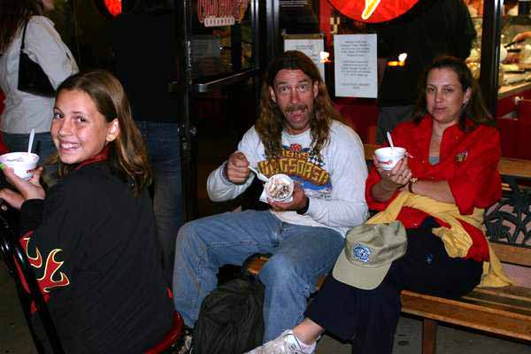 Jim, Sherri and Jimmy chow down on some chili and dogs.