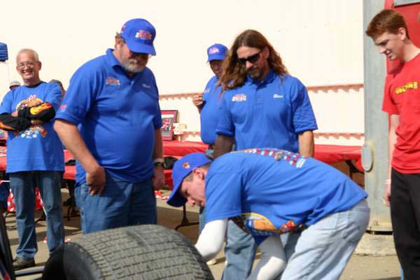 The tech inspector, Ben Thrasher, checks to see if the wheel is on tight while =is dad Mark and the “Commish” Steve Lafond look on