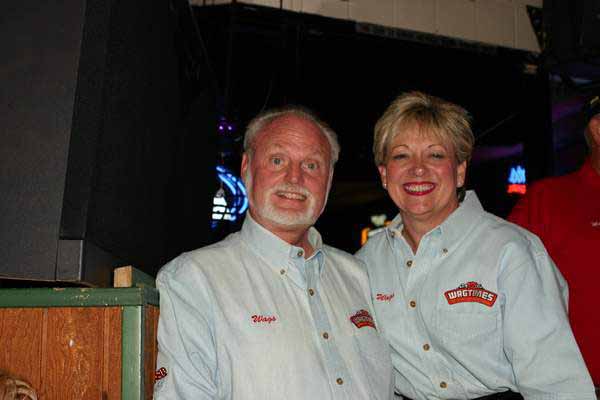 Carol Wolfe sees the camera and breaks away from her conversation with Glenn and Carol Crossno and her hubby, Jim.
