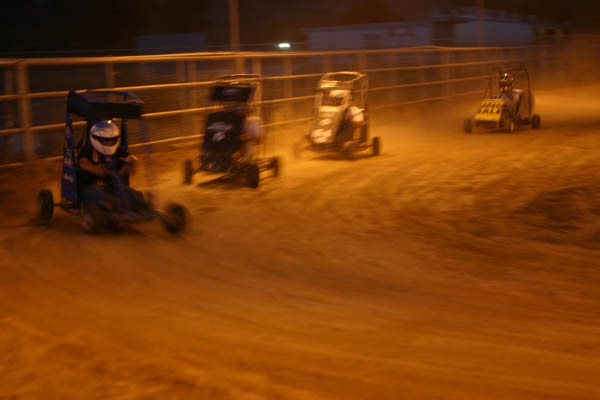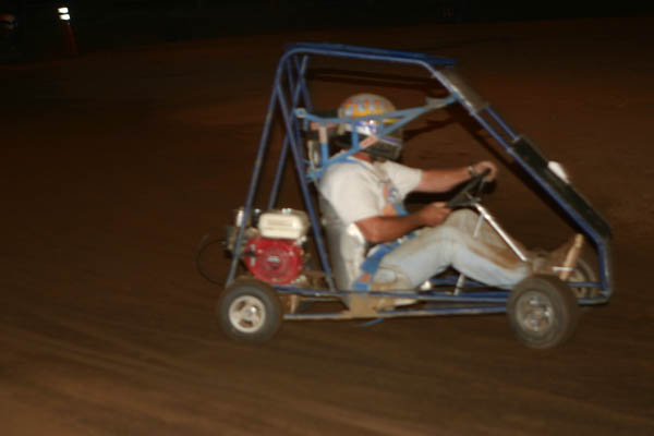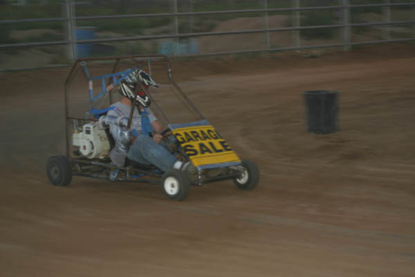 The two heats were ready to go, with the top two going into the main event. Four carts took off at the starter's hand wave. Russell didn’t get far in his Garage Sale entry and in fact did not start because of a problem when his tie rod came unbolted and he had no steering. This put him on the wrecker, a 4 wheeler pulling a small trailer. They loaded it up and took it to the pit area to repair for Tom to drive in the next heat. Blake then chased and passed Chet and Jim to win the first 10 lap heat, with Chet and Blake moving to the main. The last heat featured Rob and his son Daniel, with Ronnie and Tom if he could get the Garage sale entry ready. Rob and son were the two transferring, after Ronnie spun out and Tom came in last.