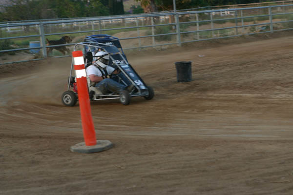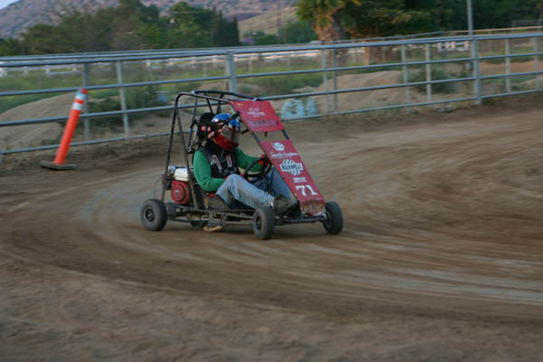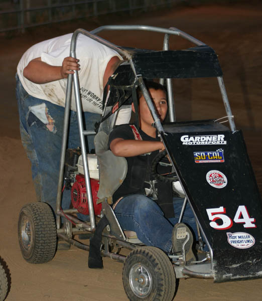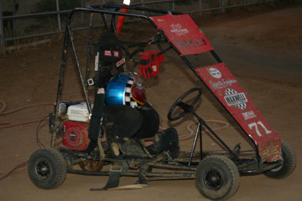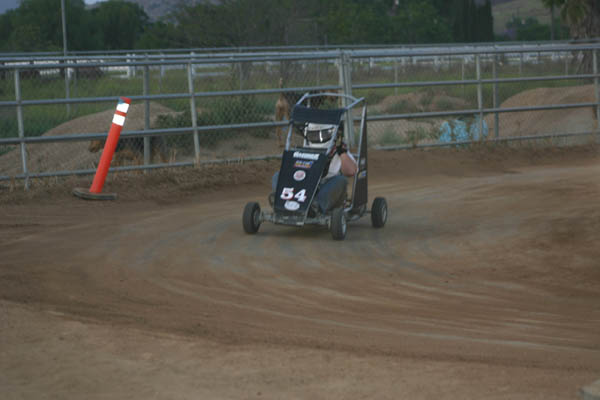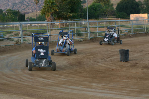 Blake Miller started the day off with fast time on the small oval at 11.60, in his Honda powered racer. With six go-carts complete with rollcages in the house it was a fun evening. They had already raced at Bobby Graham’s home track nearby earlier in the afternoon, but were ready to have some more fun at proprietor Mac McAuliffe’s Norco National Speedway.