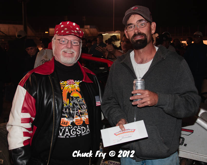 Rickie Gaunt receives $1000 jar of change, a bottle of Crown Royal and plenty of atta boys for his Wagtime/Lafond Hard Charger Award on Saturday night. Foto by Tear off Heaven Fotos