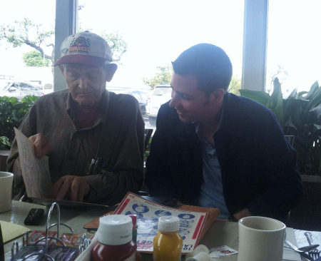 Don Weaver points out his name in a vintage racing program to Andrew Layton. Torrance, California, April 12, 2014.