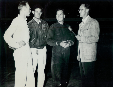 At Culver City Stadium during a radio broadcast, circa 1948. (L to R) Art Boyce, Don Weaver, Ray Crawford, and Bill Welsh, a local newsman and commentator. Crawford, a P-38 fighter ace in World War II and Captain in the Air Force Reserves, usually raced in a flight gear, pulled over a luxury business suit. (Roy C. Morris Collection)